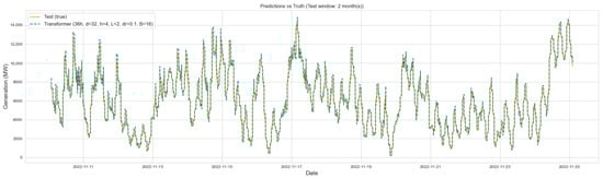Placed in the context of the existing literature, these results reinforce recent advances that highlight the benefits of attention mechanisms and hybrid designs [20,21,22,23,25]. Unlike prior work that relies on meteorological covariates or turbine-level signals, this study demonstrates that a Transformer trained exclusively on historical, aggregated generation data can achieve competitive performance. This has practical significance for the Spanish power system, where forecasting accuracy directly influences imbalance costs and operational reliability in day-ahead and intraday markets. The ability of a lightweight Transformer to deliver accurate forecasts under these constraints provides a scalable tool for system operators and market agents who may not have access to high-resolution meteorological data, thereby supporting grid stability and Spain’s broader sustainability objectives within the European energy transition.