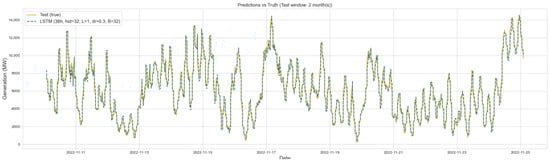 In contrast, the best LSTM and GRU models, both using 36 h input sequences, achieved higher errors. The LSTM configuration (hidden = 32, layers = 1, dropout = 0.3, and batch = 32) reached an RMSE of 397.59 MW and MAE of 292.37 MW, while the GRU (hidden = 32, layers = 1, dropout = 0.1, and batch = 16) slightly outperformed the LSTM with an RMSE of 395.47 MW and MAE of 289.11 MW. Although both recurrent models improved substantially over the naïve 1 h lag benchmark (MAE ≈ 378 MW), they lagged behind the Transformer in all metrics. Particularly, scale-independent measures such as nRMSE and sMAPE showed consistent advantages for the Transformer (5.92% and 4.85%, respectively) compared to the recurrent baselines (nRMSE ≈ 6.3–6.6% and sMAPE ≈ 5.7–6.1%). Visual inspections over a two-month segment of the test set further confirmed these results, with the GRU systematically underpredicting peaks and lagging during ramps, the LSTM tracking moderate fluctuations but occasionally overshooting in highly volatile conditions, while the Transformer provided the closest alignment across both gradual and abrupt dynamics.