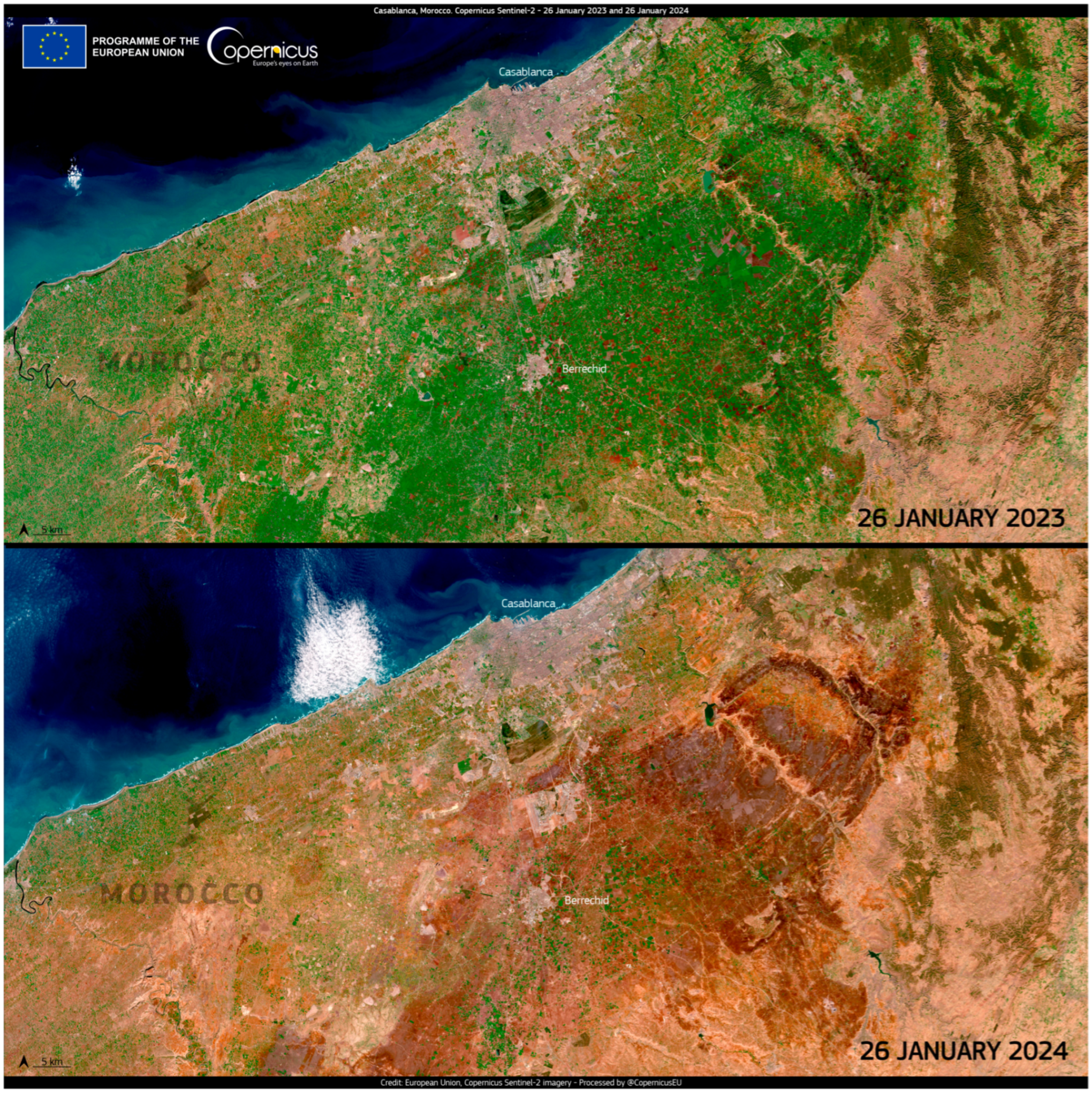 Moreover, the drought situation in Casablanca and across Morocco has dramatically worsened in recent years, with 2024 marking one of the most critical episodes on record. Satellite imagery from NASA’s MODIS sensors (
