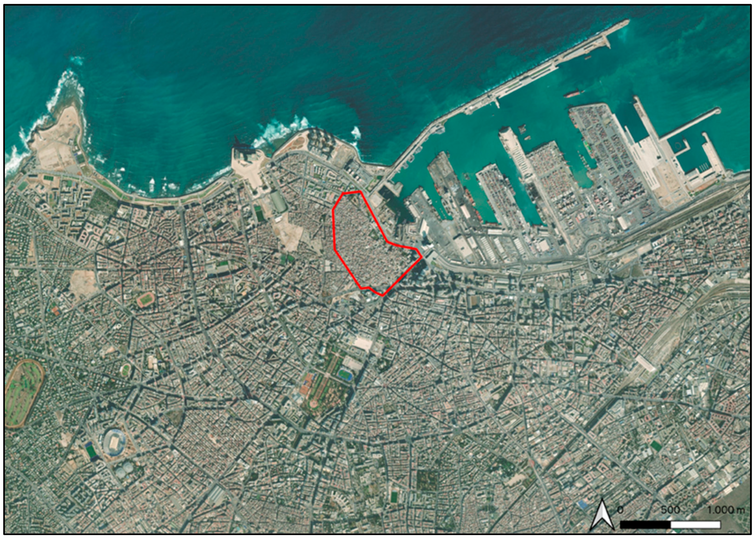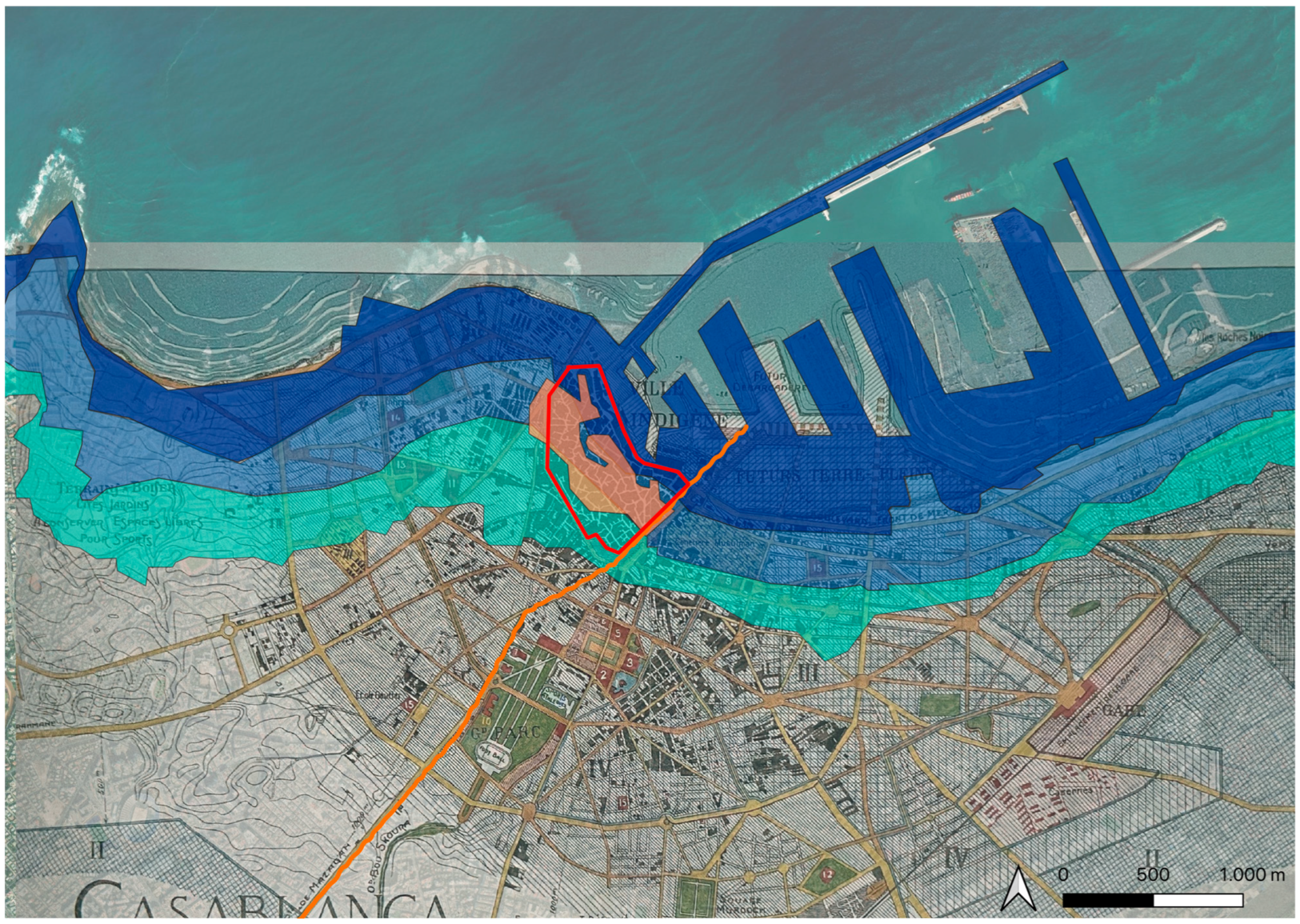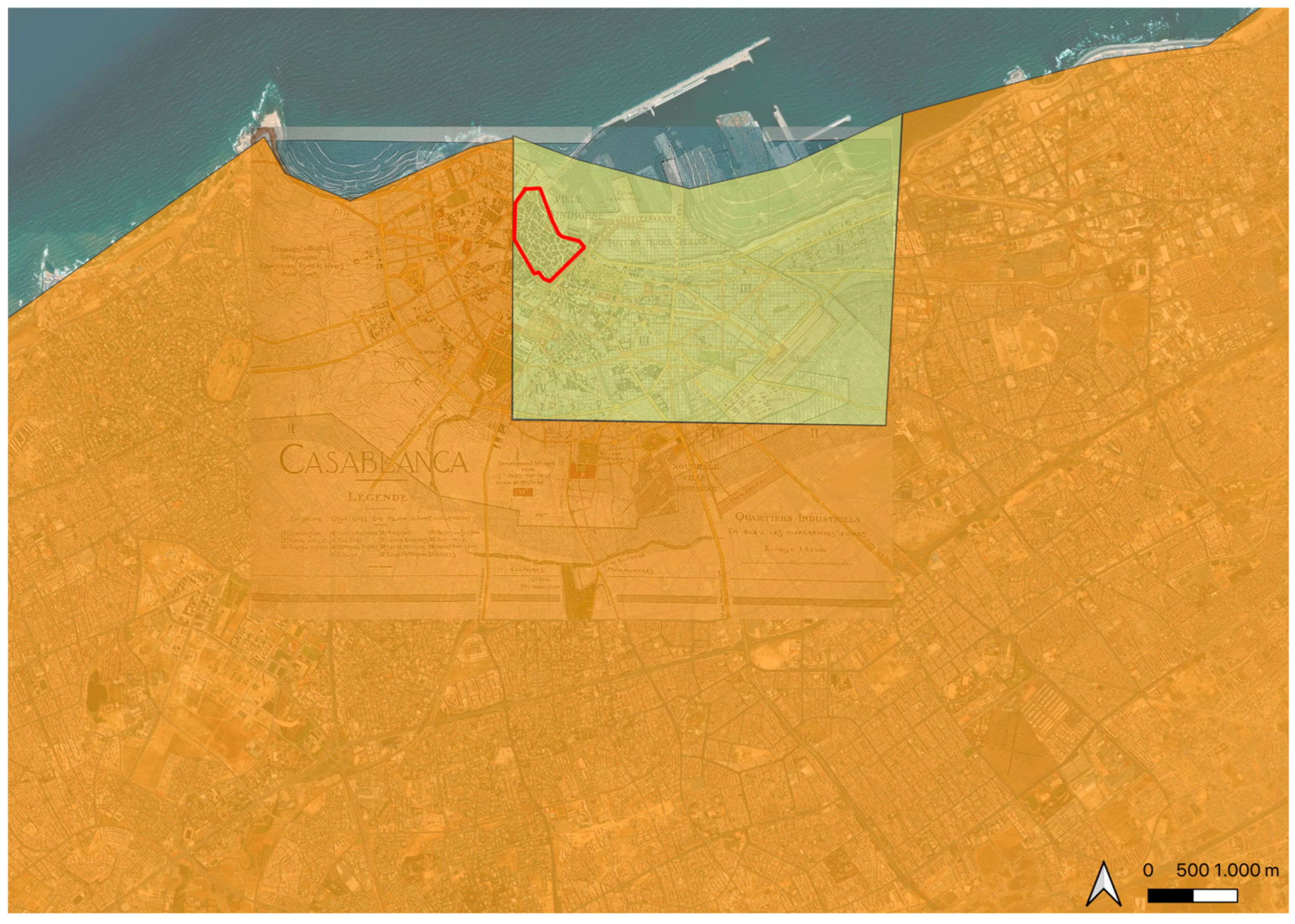 This study adopts a historically informed, spatially grounded Geographic Information System (GIS) methodology to explore how early-20th-century French planning shaped present-day risks in Casablanca. The analysis focused on coastal zones and historic quarters that underwent major interventions during the period. High-resolution raster scans of historical cartography, most importantly Henri Prost’s Plan d’aménagement et d’extension de Casablanca (Maroc). 1917 and Plan d’aménagement et d’extension de Casablanca (Maroc): plan de Casablanca (éch. 1/10.000e), 1929, were imported and georeferenced with the QGIS 3.28 Georeferencer tool (QGIS Development Team, Open Source Geospatial Foundation, Beaverton, OR, USA). These materials were extracted and consulted in his personal archive where multiple materials are located related to interventions from 1913 to 1929 [