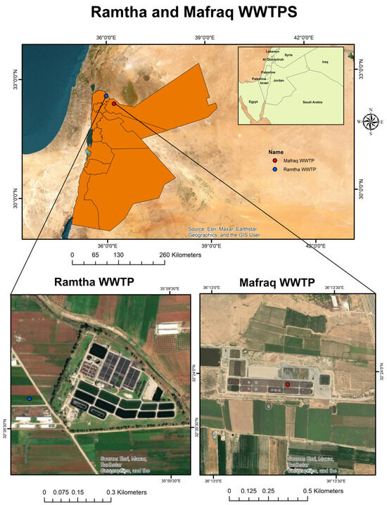 The geographical position of the study region: a map showing the locations of the Ramtha and Mafraq wastewater treatment plants (WWTPs) in northern Jordan, with satellite insets highlighting the WWTP sites and adjacent irrigated and control fields. Basemap sources: Esri, Maxar, Earthstar Geographics, and the GIS User Community.