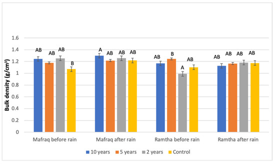 Effects of irrigation duration, rainfall, and location on soil bulk density. Bars represent mean values ± SE. Different letters above bars indicate significant differences at p < 0.05 according to Tukey–Kramer HSD test.