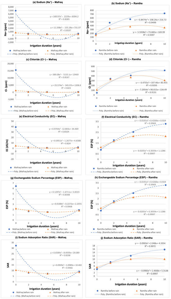 The polynomial regression confirmed that salinity parameters in Mafraq followed a quadratic trend, decreasing from the control to 5 years and then increasing at 10 years, whereas in Ramtha the variables exhibited a positive linear trend with the irrigation duration (Figure S1a–e).