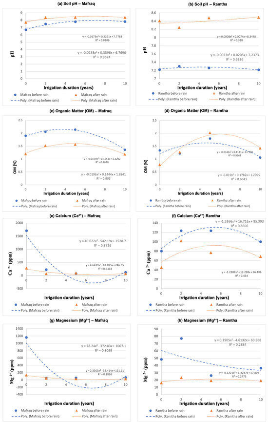 As shown in Figure 4a, the pH in Mafraq exhibited a slight quadratic trend, with values increasing from the control to 5 years of irrigation and then stabilizing by 10 years. Before rainfall, the pH curve was lower, whereas after rainfall, the values shifted upward to values over 8.0 across all treatments. This suggests that the rainfall enhanced alkalinity, likely due to the leaching of soluble salts and a relative increase in the carbonate/bicarbonate buffering capacity. The rise in pH is consistent with calcareous soils, where the dissolution of CaCO3 and the removal of acidic ions (H+, Al3+) during rainfall events reduce soil acidity.