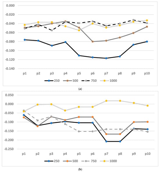 All 10 nationwide models show that the Stage 2 and Stage 3 models are statistically and significantly better than the Stage 1 model (Table 2). For example, at P4 (right after the landslide), the Stage 2 model shows an R2 change of 0.140 and an F change of 353.646 at the 0.001 significance level. In the Stage 3 model, the R2 change is 0.249, and the F change is 2643.223. These results indicate that neighborhood, city, and temporal factors should be considered when analyzing changes in APT prices, supporting the suitability of the hierarchical linear model. For a more specific example, in the post-landslide period (p4), the regression coefficients for the group within 250 m of the landslide are as follows: only Stage 1 characteristics are considered (−0.072), Stage 2 characteristics are included (−0.101), and Stage 3 characteristics are added (−0.081). The results highlight that prior studies, which do not consider neighborhood, city, and temporal characteristics, may have biased coefficients in the econometric model.