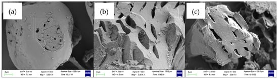 The surface morphology images of SH, SH0, and SH2 are shown in Figure 1. The surface of SH had few pores and cavities (Figure 1a), the surface of SH0 was rough and partially porous after the carbonisation of SH at 400 °C (Figure 1b). Furthermore, the addition of the KOH activator significantly increased the pore density of SH2, as seen in Figure 1c. Yang et al. found that activation by KOH is a crucial factor in generating numerous disordered pores at high temperature values [28]. The irregular pores and cavities on the surface of SH2 indicated that KOH had broken ether bonds within lignin and hydrolysed glycosidic bonds within hemicellulose and cellulose [29]. The MB dye macromolecules can migrate through these pores and cavities to the active regions within the inner pores of SH2.