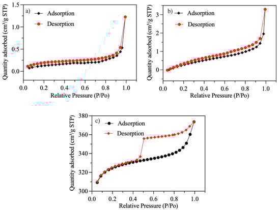 The N2 desorption/adsorption isotherms of (a) SH, (b) SH0, and (c) SH2.