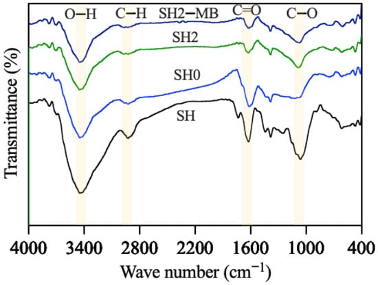 FTIR transmittance spectra of SH, SH0, SH2, and SH2 adsorbed with MB.