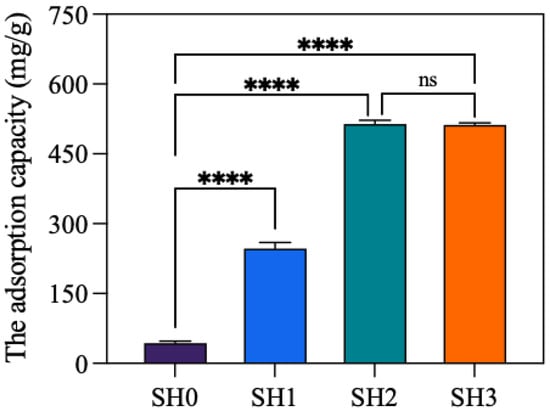 The adsorption capacity of unactivated Sapindus shell biochar (SH0) and KOH-activated Sapindus shell biochar at different activation ratios (SH1, SH2 and SH3). Data are marked with asterisks (****) to indicate a very highly significant difference (p < 0.0001), and “ns” denotes a non-significant difference.