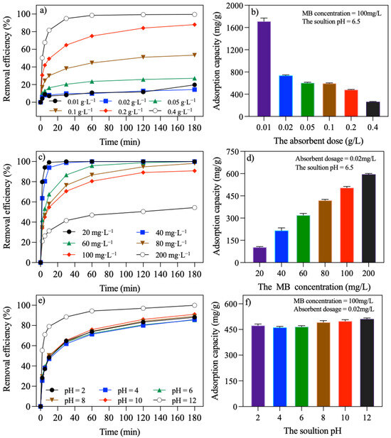 Impact of adsorbent amounts (a,b), MB concentration (c,d), and pH (e,f) on SH2 adsorption of MB dye.