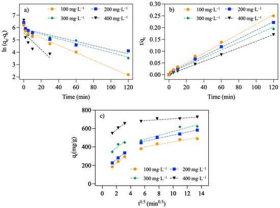 (a) PFO, (b) PSO, and (c) IPD models for MB adsorption via SH2 at 25 °C.