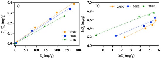 (a) Langmuir model and (b) the Freundlich model for MB adsorption via SH2 at 298, 308, and 318 K.