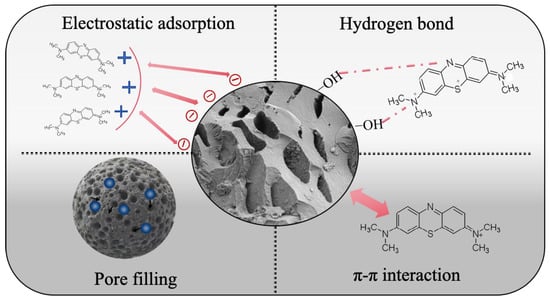 The mechanism of MB adsorption by SH2 is shown in Figure 8. The BET analysis indicated that the ultra-high SSA and mesoporous structure of SH2 provide abundant active sites and promote the pore filling effect. The pH experiment results and the pHpzc value (6.35) also indicated that under alkaline conditions, the electrostatic attraction between the MB dye (positive charge) and the SH2 surface (negative charge) is the dominant mechanism. Insights from FTIR analysis further confirmed the role of the FGs on the surface of SH2 in the removal of MB. Furthermore, the entire adsorption behaviour can be described by the Langmuir isotherm and the PSO model, confirming that the process is mainly characterised by monolayer chemical adsorption. In conclusion, the efficient adsorption of MB onto SH2 is driven by the synergy of multiple mechanisms, including pore filling, electrostatic attraction, π-π interaction, and hydrogen bonding.