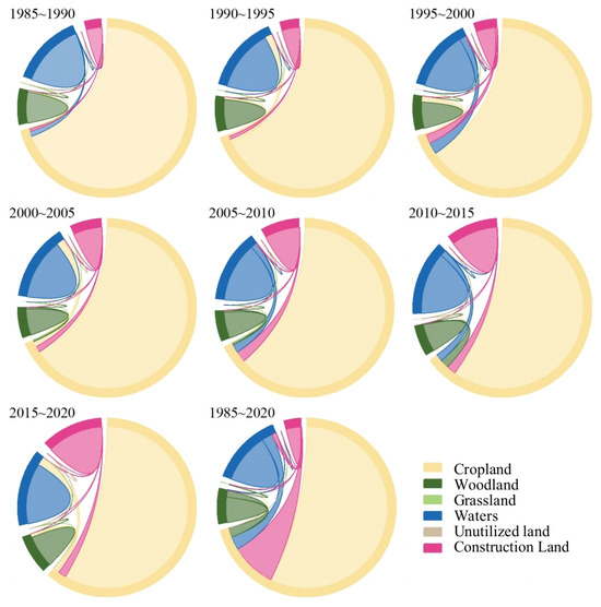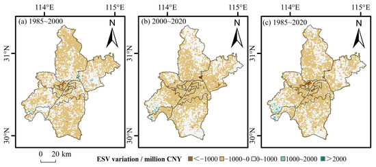 (1) Regionalized ESV coefficients adjusted to local grain yield. We developed and applied locally adjusted equivalent factors based on regional grain yields to improve the contextual suitability of the ESV estimates for Wuhan. Although the citywide ESV total showed limited fluctuation over the 35-year period, cultivated land area continuously declined, whereas built-up land expanded markedly; in particular, ESV in the urban core exhibited a clear downward trend. These results indicate that rapid urbanization exerts a substantial disturbance on ecosystem service provision and confirm the feasibility of regionalized equivalent factors for tracking changes in ESV during urban expansion.