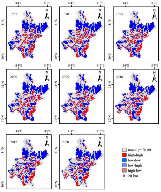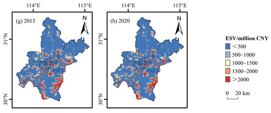 (2) Spatially, ESV in the urban core showed a clear downward trend, with low-value zones expanding outward from the center, while high-value zones were concentrated around the Yangtze and Han rivers. The global Moran’s I consistently remained above 0.70 (p < 0.01), indicating significant positive spatial autocorrelation. “High–high” clusters were mainly located in water-rich areas, whereas “low–low” clusters were concentrated in urban expansion zones.