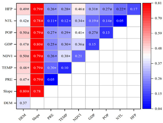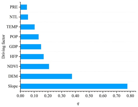 (2) Complementary use of Geodetector and GWR. Geodetector was used to identify dominant drivers and interaction types (e.g., “slope ∩ GDP” and “slope ∩ human footprint,” showing bivariate or nonlinear enhancement), whereas GWR revealed the local heterogeneity and the spatial distribution of positive and negative effects. The combined use of these two methods strengthens the explanatory power of the driving mechanisms and provides richer spatial details.