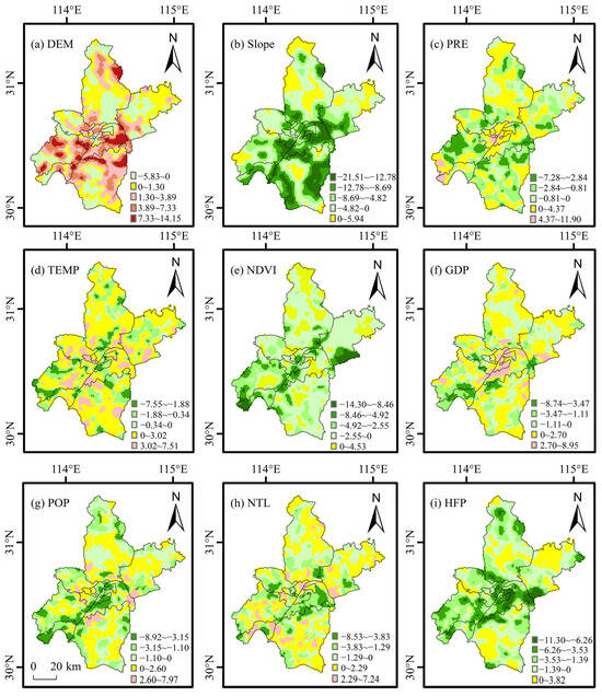 (5) Overall, changes in Wuhan’s ESV were primarily driven by natural factors. However, in densely populated and economically developed urban cores, socioeconomic drivers significantly amplified their influence through interactions with natural factors, resulting in pronounced spatial heterogeneity. To maintain and enhance ecosystem services, sustainable planning should prioritize the protection of water bodies, croplands, and forests, and incorporate ESV-oriented zoning into urban planning. Measures such as wetland and riparian restoration, slope-sensitive controls, and low-impact development should be combined with financial and institutional instruments to achieve net-neutral or net-positive ESV outcomes.