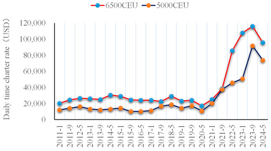 Affected by the imbalance between supply and demand in the Ro-Ro shipping market, the charter rates for Ro-Ro vessels have been rising continuously. Since the fourth quarter of 2021, the charter rates in the international Ro-Ro shipping market have shown a gradual upward trend. As can be seen from Figure 1, between May 2020 and September 2023, the daily time charter rates for Ro-Ro vessels surged dramatically: the rate for a 6500-CEU vessel climbed from less than USD 20,000 to USD 115,000 per day, representing a nearly sixfold increase, while that for a 5000-CEU vessel rose from USD 11,500 to USD 90,000 per day—an approximately 6.87-fold jump. Even though the charter rates saw a seasonal decline in 2024, they still remained as high as USD 70,000 per day. The Ro-Ro shipping market has thus entered its strongest performance in history.