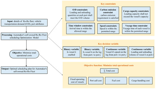 To address the complexity of the proposed Ro-Ro fleet scheduling optimization model and enhance its understandability, a logic diagram (Figure 2) is constructed to systematically illustrate the model’s workflow.