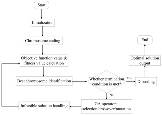 To solve the above-mentioned bi-level model, the specific algorithm based on the genetic algorithm (GA) is designed. The choice of GA is determined by the model’s core characteristics: First, the model involves NP-hard combinatorial optimization, where GA avoids the “curse of dimensionality” of exact algorithms and flexibly handles infeasible solutions via feasibility repair operators and penalty functions. Second, GA maintains solution diversity through population-based evolution, preventing local optima that often occur in single-point search methods. The flowchart of the algorithm is shown in Figure 3. The detailed steps are as follows.