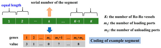 Step 1: Generate an initial population (N denotes the number of chromosomes in the population). For each chromosome, the coding method is shown in Figure 4. Specifically, the chromosome adopts a segmented structure, consisting of K gene segments of equal length, which represent the routes of K vessels. The k-th gene segment has a fixed length of m1 + m2 genes, and the gene coding method is shown in Table 4. The sub-steps for generating a gene segment are as follows.