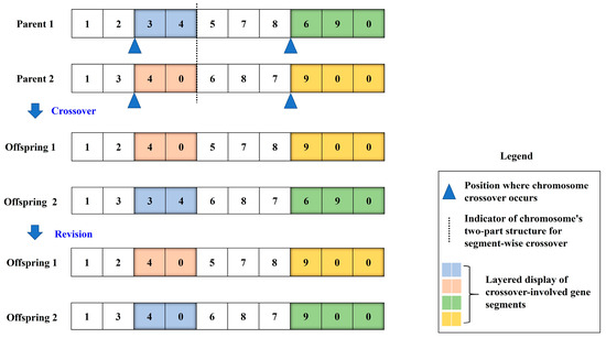In the crossover operation, offspring chromosomes that violate the constraint of “each port being callable at most once” may be generated. For such infeasible solutions, the following correction method can be adopted: For the first m1 gene loci and the last m2 gene loci of each gene segment, examine them starting from the front of the gene sequence, respectively. If a port has already appeared, all subsequent occurrences of that port gene shall be revised to 0; if there remain subsequent port calls after this revision, these port genes shall be shifted forward sequentially to fill the vacancies. An example of correcting an infeasible solution generated by the crossover operation is shown in Figure 5.