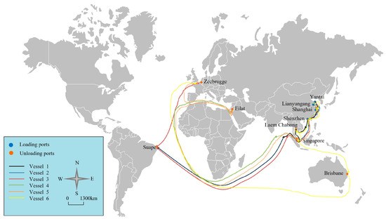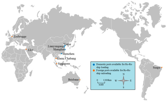 In order to verify the effectiveness of the methodology proposed in Section 3 and Section 4, this study takes the Ro-Ro fleet established by BYD (Build Your Dreams), a leading Chinese NEV manufacturer, as the case study object, and optimizes the operational scheduling scheme of its fleet. BYD has announced an ordered for six Ro-Ro vessels, which will be put into operation sequentially around 2025. BYD has domestic vehicle factories located in Xi’an, Zhengzhou, Jinan, Changzhou, Hefei, Xiangyang, Shanghai, Fuzhou, Changsha and Shenzhen. Prior to initiating maritime transportation, finished vehicles are generally consolidated at coastal ports in eastern and southern China via inland waterway or land transportation for loading. Therefore, this study takes Yantai Port, Lianyungang Port, Shanghai Port and Shenzhen Port as the domestic loading ports. These ports have well-developed Ro-Ro terminal facilities for cargo distribution, while also enabling convenient gather of finished vehicles produced by domestic factories through inland waterway or land transportation. The export destinations for BYD’s finished vehicles primarily encompass Europe, South America, Southeast Asia, the Middle East, and Oceania. Specifically, Zeebrugge Port in Belgium is selected as the unloading port for Europe, Suape Port in Brazil for South America, Laem Chabang Port in Thailand and Singapore Port in Singapore for Southeast Asia, Eilat Port in Israel for the Middle East, and Brisbane Port in Australia for Oceania. Consequently, there are a total of 4 loading ports and 6 unloading ports, as illustrated in Figure 6.