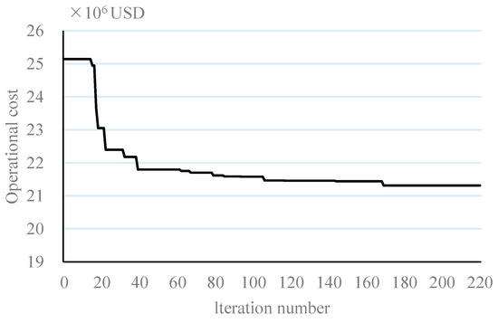 The above case experiment was conducted on a Windows 10 operating system with an Intel(R) Core(TM) i5-8250U processor and 8 GB of memory. The genetic algorithm code for the model was written using Python 3.9, with the following runtime parameters: 220 iterations, a population size of 50, a crossover probability of 0.6, and a mutation probability of 0.05. After multiple runs (the average execution time is 125 s), the case calculation results were obtained, and the iteration curve is shown in Figure 7. Table 7 presents the derived sailing sequence of each vessel, the speed for each voyage leg, and the number of vehicles loaded/unloaded at each port. The schematic diagram of the optimized fleet routes is shown in Figure 8.