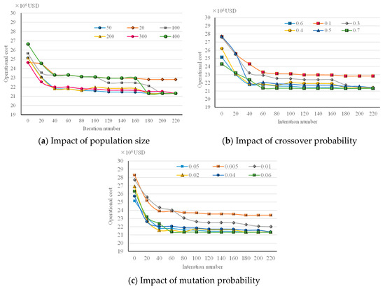 The influence of mutation probability is displayed in Figure 9c. When modifying only the mutation probability, for low mutation probabilities (0.005–0.04), the algorithm failed to introduce sufficient new genetic information to break through the local solution space. This led to the algorithm being trapped in a plateau phase during iterations and the final converged operational costs were 0.3–9.8% higher than those achieved with the mutation probability of 0.05. When the mutation probability was increased to 0.06, the final converged cost was essentially identical to that of the 0.05 group. However, the iteration process of the 0.06 group exhibited more significant fluctuations in the early stage. The cost curve oscillated sharply before stabilizing, which was caused by excessive randomization disrupting the initial stable gene segments. In contrast, the mutation probability of 0.05 maintained population stability to prevent unnecessary cost fluctuations, while introducing enough new genetic information to help the algorithm avoid local optima.