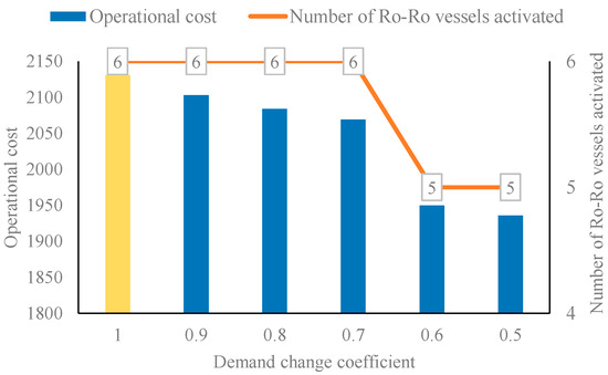 It reveals that as demand in the European region decreases, the operational costs of the Ro-Ro fleet exhibit a synchronous downward trend. When the demand reduction exceeds 40% (corresponding to the range of demand coefficients from 0.6 to 0.5), the number of Ro-Ro vessels in operation will be reduced from 6 to 5 due to a substantial contraction in transportation demand, leading to a further decline in operational costs. In this situation, for the manufacturer’s self-owned fleet, if it only undertakes transportation tasks for its own products, its operational status will be highly dependent on fluctuations in market orders: insufficient transportation demand will result in idle capacity of some vessels within the fleet. It is therefore proposed that transportation services be extended to manufacturers of other brands to achieve full utilization of the self-established fleet’s capacity.