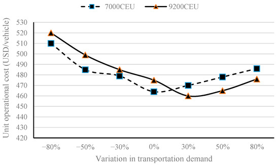 Considering that the vessel type exerts an impact on the operational scheduling and operational cost of the fleet, a sensitivity analysis on vessel type is conducted to assess the impact of different Ro-Ro vessel types on the fleet’s unit operational cost under varying demand levels. The analysis uses projected automotive demand during the planning period as the baseline market demand. Under various demand scenarios, it assumes that the loading capacity of Ro-Ro vessels consistently exceeds market demand. The results are shown in Figure 11, yielding two key insights.
