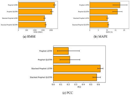 | RMSE | Stacked Prophet LSTM | Stacked Prophet QLSTM | −1.88 | 0.08 | −66.94 | None |