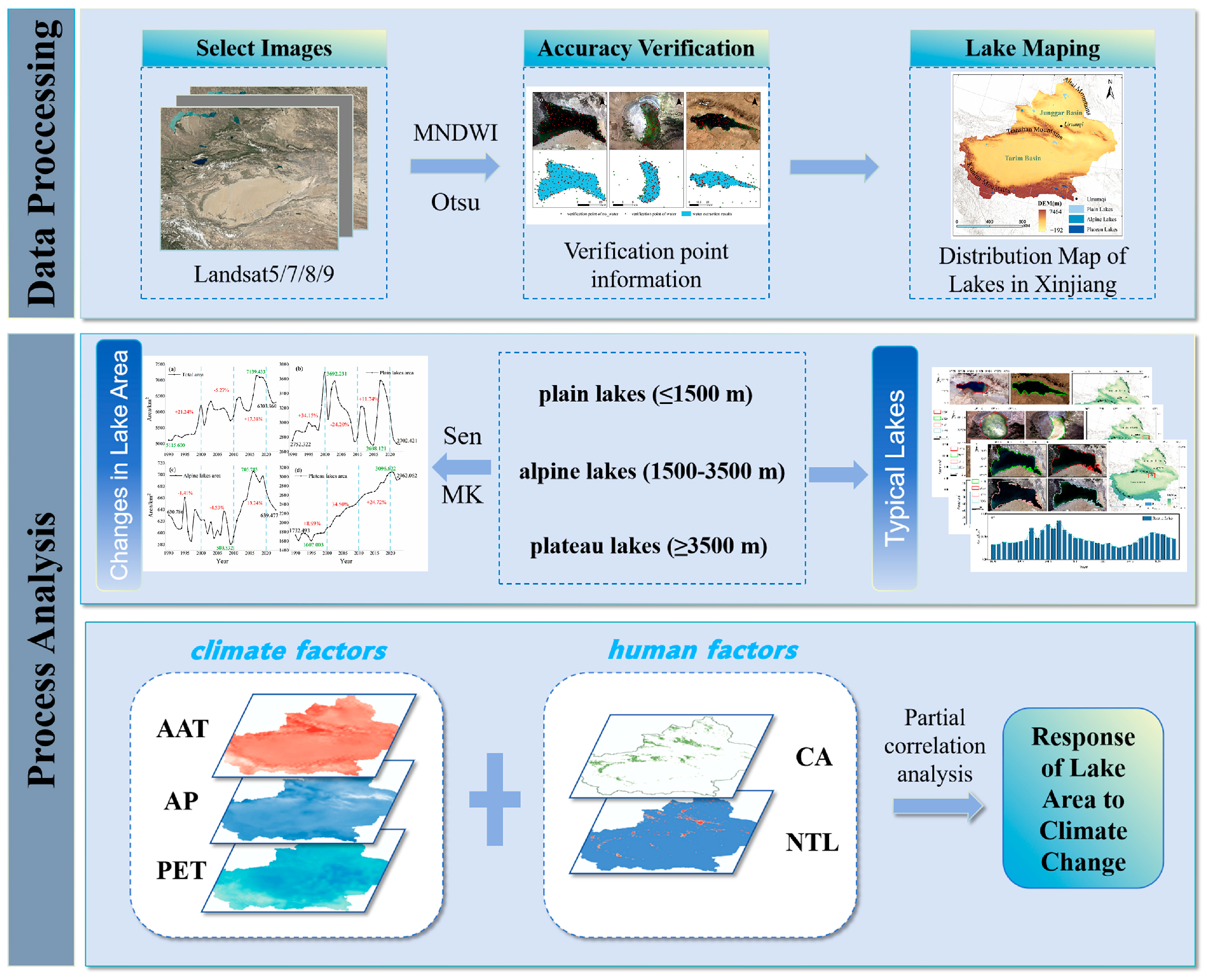 - Zhang, J.; Zhou, J.; Zhang, G.; Ji, Y.; Zeng, Y.; Fan, W. Climate and human-driven variations in lake area and number in North Xinjiang, China. Int. J. Remote Sens. 2021, 42, 469–485. [Google Scholar] [CrossRef]