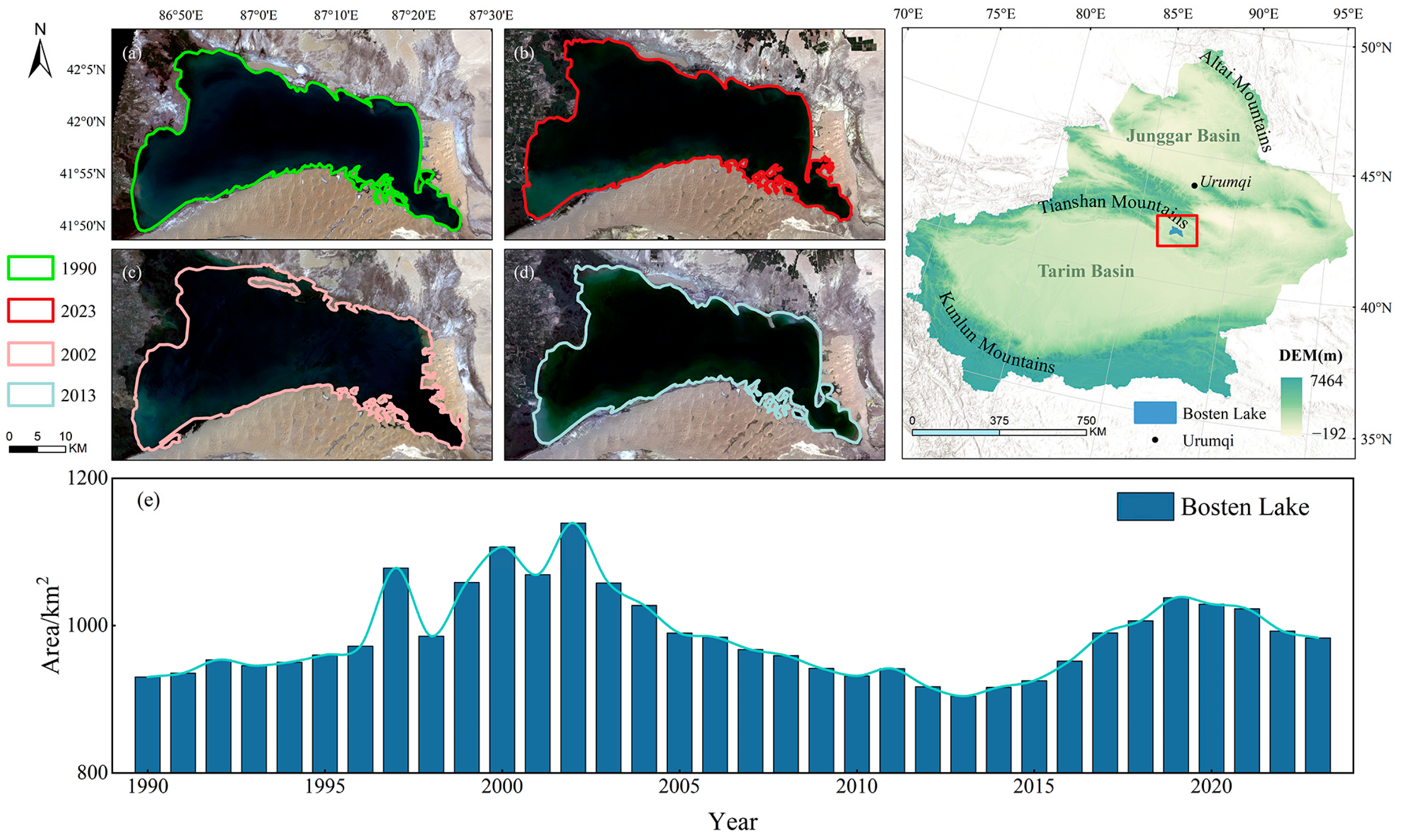 - Li, X.; Zhang, F.; Shi, J.; Chan, N.W.; Cai, Y.; Cheng, C.; An, C.; Wang, W.; Liu, C. Analysis of surface water area dynamics and driving forces in the Bosten Lake basin based on GEE and SEM for the period 2000 to 2021. Environ. Sci. Pollut. Res. Int. 2024, 31, 9333–9346. [Google Scholar] [CrossRef] [PubMed]