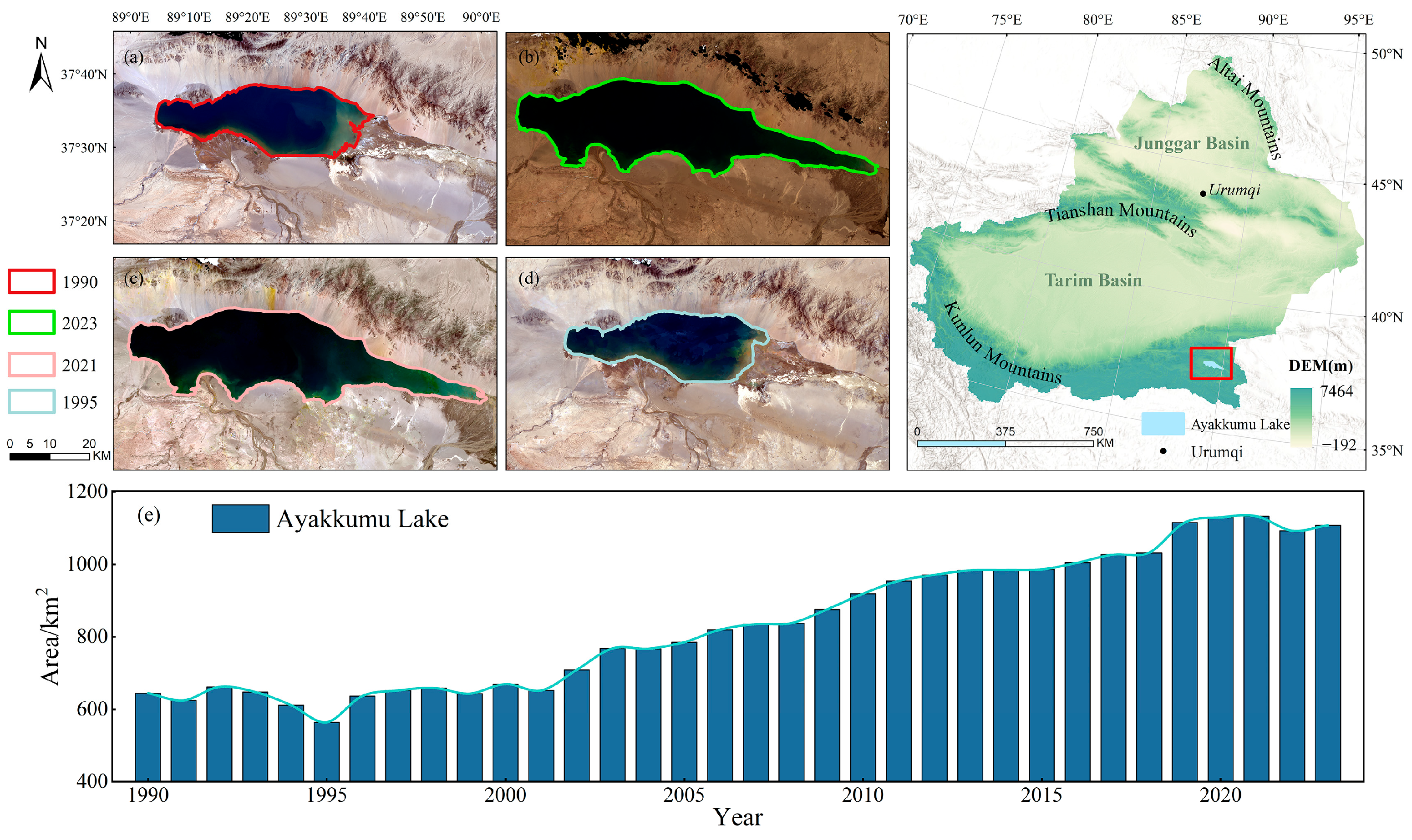 - Naeem, M.; Zhang, Y.; Vahid, N.; Tian, X.; Miao, P. Both climate and anthropogenic impacts on recent lake area change in the Erdos Plateau. J. Environ. Manag. 2025, 373, 123443. [Google Scholar] [CrossRef] [PubMed]