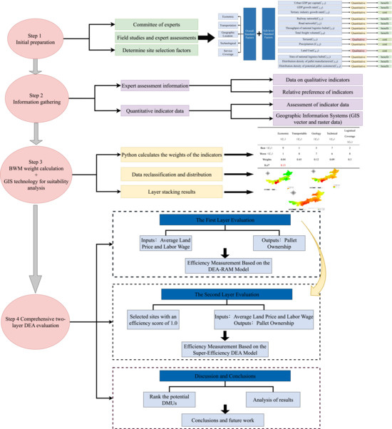 Based on the literature review, this study addresses the following research question: How can we develop a scientific and effective method to select the optimal location for a pallet pooling service center? This problem is complex and involves multi-dimensional constraints. It requires a comprehensive assessment of transport accessibility, land price, labor wage, geographic conditions, technological readiness, and pallet service coverage. The GIS analysis accounts for spatial heterogeneity, scale effects, and layer reclassification, and the suitability maps reflect these factors. Criterion weights are derived from BWM and expressed as global weights across categories and sub-criteria; these weights are matched to the suitability maps. Candidate sites are treated as DMUs. GIS suitability is linked to input–output efficiency using DEA-RAM and super-efficiency, and the results are visualized on the map. When several locations are efficient, the approach yields a stable and discriminative ranking. The framework is applicable to different logistics scenarios through parameter calibration, while the model structure remains unchanged. To address the theoretical and practical gaps identified above, this study proposes a BWM-GIS-DEA integrated site selection framework for pallet pooling service centers, which incorporates multi-dimensional decision criteria, spatial analysis, and dynamic efficiency measurement to support optimal resource allocation in broad and complex regional scenarios. First, the BWM model is used to quantify the weights of 13 decision criteria, such as tertiary industry growth rate, railway network, and terrain factors, addressing the issues of high subjectivity and low consistency in traditional weight calculation methods. Then, suitability maps are generated based on GIS spatial overlay technology to select the alternative areas with both site advantages and resource endowments. Finally, the two-layer DEA model is applied to break through the traditional efficiency boundaries and realize the precise ranking of fully efficient units.