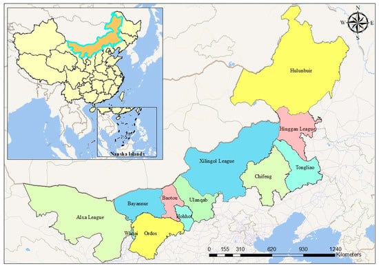 The proposed integrated BWM-GIS-DEA comprehensive decision-making model is applied to the site selection of pallet pooling service centers in Inner Mongolia, China. As shown in Figure 2, Inner Mongolia spans across three major regions: Northeast, North, and Northwest China. Currently, Inner Mongolia has not yet established a pallet pooling system. As a result, the region has a pallet standardization rate of less than 10%, a unit logistics cost 5% higher than the national average. Establishing pallet pooling service centers can effectively improve pallet standardization rates and significantly reduce logistics costs. Therefore, it is imperative to establish pallet pooling service centers to enhance regional logistics efficiency and reduce overall logistics expenditures.