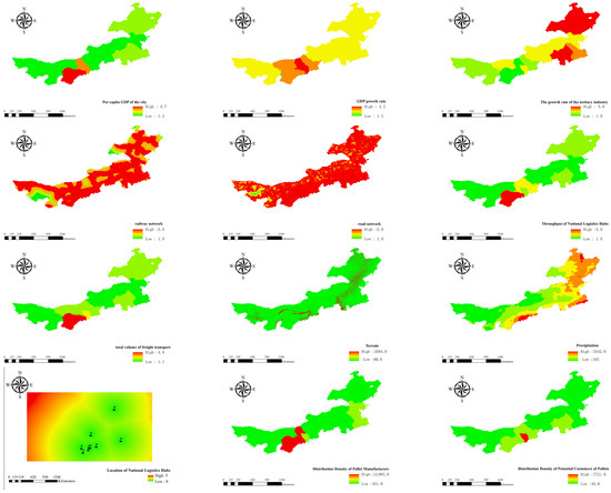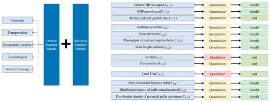 The results indicate that transportation factors hold the highest weight. Specifically, factors such as railway and road networks, the throughput of national logistics hubs, and total freight volume significantly influence the site selection decision. These factors not only affect the convenience and timeliness of transportation but also play a major role in determining transportation costs, which directly impact the service efficiency of pallet pooling service centers. In particular, shorter distances to railway and road networks lead to lower transportation costs and higher service efficiency. National logistics hubs with higher throughput and larger freight volumes show stronger regional pallet demand. This increase further promotes the growth of pallet pooling. Therefore, transportation factors are critical in optimizing the site selection of pallet pooling service centers.