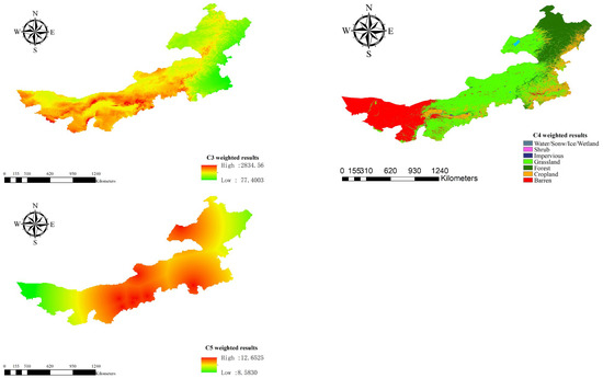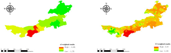 In this task, the weights of 13 criteria are determined across five dimensions: economic factors (C1), transportation factors (C2), geographic location factors (C3), technological factors (C4), and service coverage factors (C5). In this study, the reclassification process was applied to transform the original raster layer values into new indicator categories. Reclassification refers to reorganizing or reinterpreting the values of raster data, with the critical step being to establish a clear correspondence between the original data and the newly defined classes. The criteria for reclassification were determined according to the characteristics of the original datasets and the practical conditions of the Inner Mongolia Autonomous Region, and further refined through expert consultation to ensure that the indicator settings are reasonable and locally applicable. The correspondence between the original values and the reclassified results is presented in Table 2.