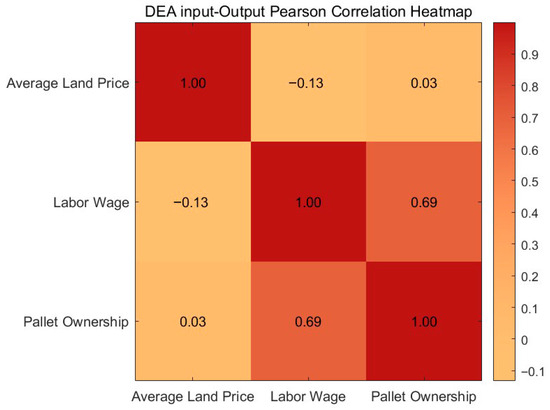 The Pearson correlation coefficients among the DEA input and output variables are shown in Figure 8. The correlation between Labor Wage and Pallet Ownership is 0.69, which indicates a moderate positive relationship. In contrast, the correlations of Average Land Price with Labor Wage (−0.13) and with Pallet Ownership (0.03) are both weak and reflect almost no linear relationship. These results suggest that no significant multicollinearity exists among the variables, and the variables are suitable for inclusion in the DEA model.