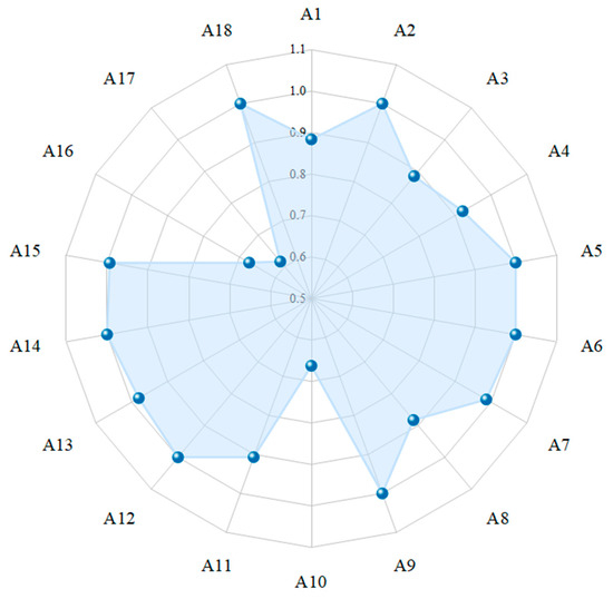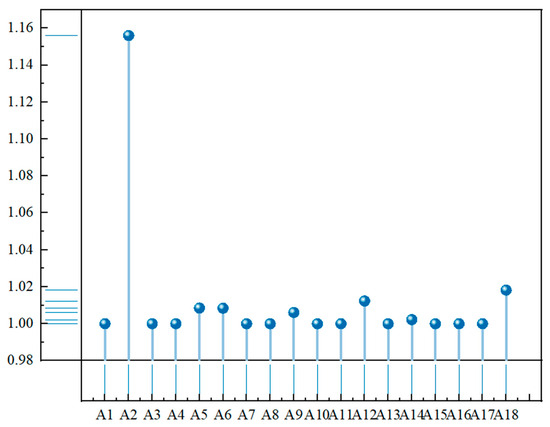 In this study, the preliminary efficiency measurement of the 18 DMUs is conducted using the DEA-RAM model, and the results are presented in Figure 9. 7 DMUs (A2, A5, A6, A9, A12, A14, and A18) lie on the production frontier, with each achieving a technical efficiency score of 1.0. This result reflects a phenomenon of efficiency homogenization. Given the limitations of the traditional DEA model in distinguishing among fully efficient DMUs, which hinders the prioritization of sites for constructing pallet pooling service centers, this study proposes a super-efficiency DEA model for secondary measurement. This approach allows fully efficient DMUs to surpass the frontier boundary, establishes a differentiated efficiency scale, and quantifies the relative advantages among efficient units, thereby providing a refined basis for hub site prioritization.