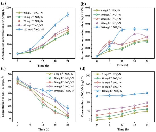 3.1. Nitrogen Transformation at Different NO2−-N Concentrations