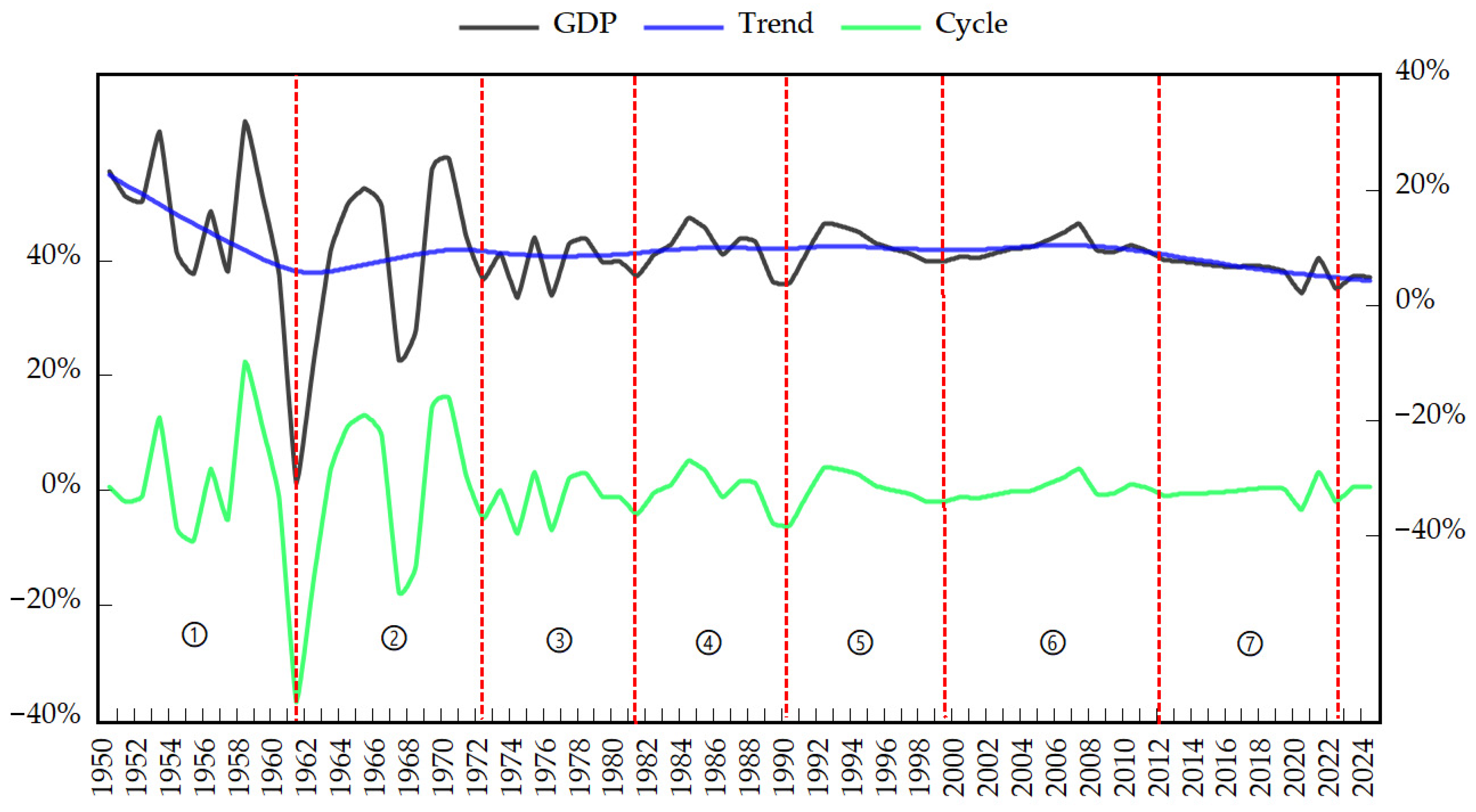 Using Juglar’s methodology, we identify seven complete Juglar cycles in China’s economic trajectory from 1951 to 2024, as presented in