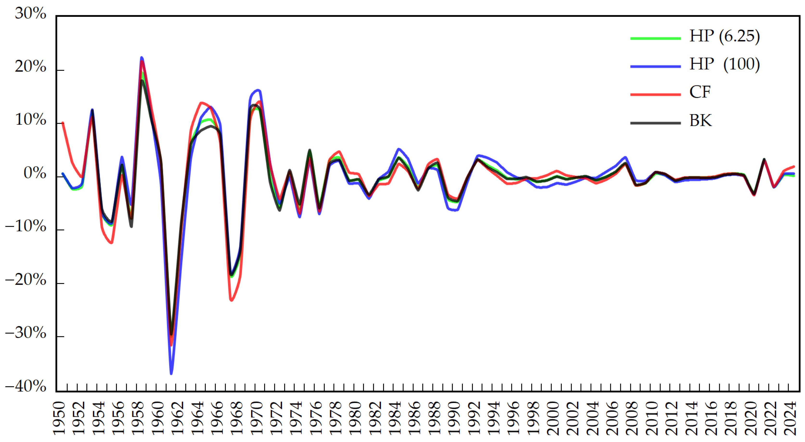 Total Factor Productivity (TFP): Total factor productivity is incorporated to isolate the driver of economic growth beyond simple factor accumulation. TFP represents the portion of output growth attributable to technological progress, efficiency improvements, organizational optimization, and institutional change. Analyzing the cyclical component of TFP growth helps identify changes in economic efficiency and is critical for assessing the quality and sustainability of growth, beyond the short-term effects of policy stimulus. The TFP data for China used in this study are obtained from the Penn World Table (PWT), version 10.01, where it is computed based on the Solow residual methodology [