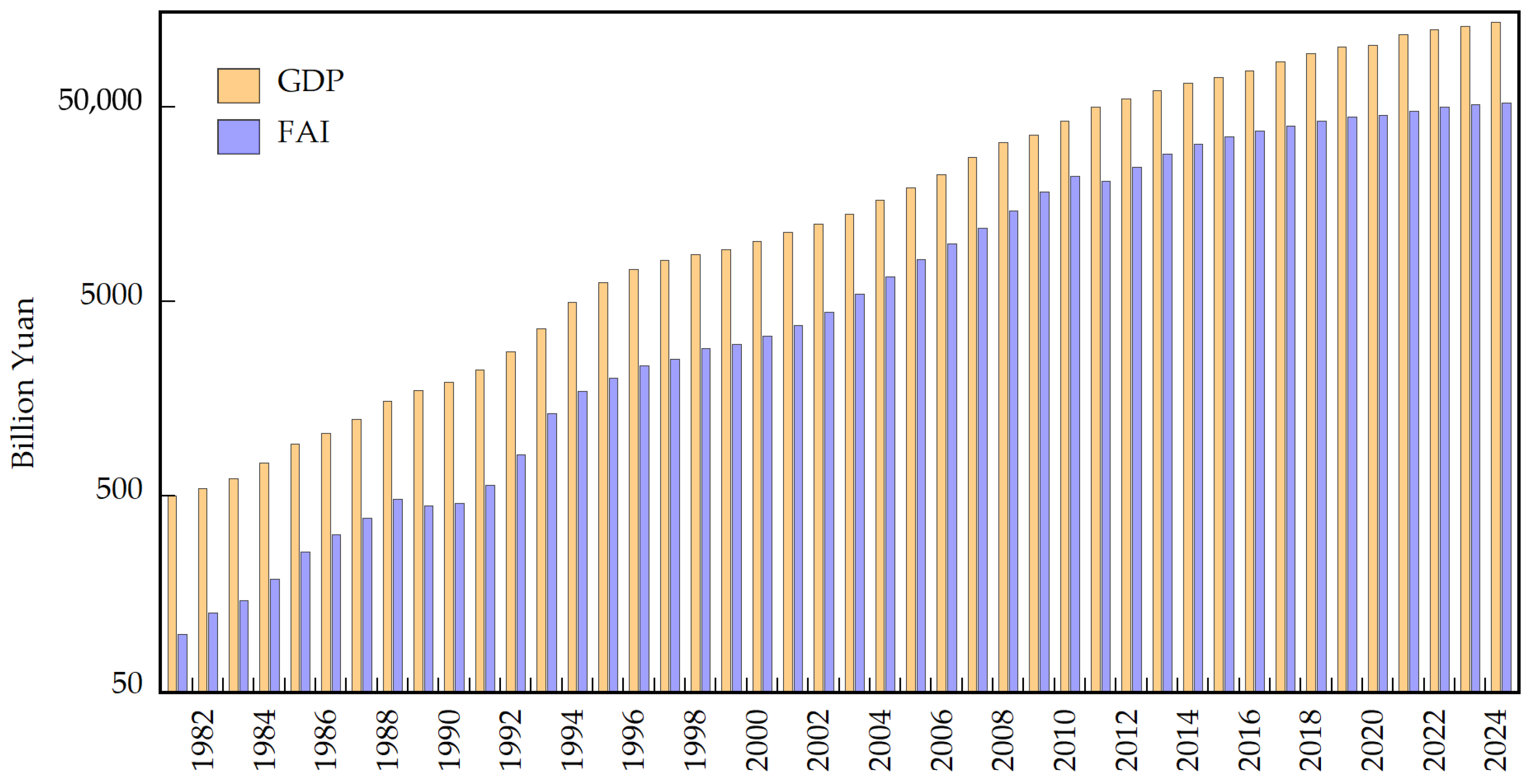 Figure 3, GDP and FAI are represented by orange and blue bars, respectively. China’s FAI increased from 96.1 billion yuan in 1981 to 52.0916 trillion yuan in 2024, representing a 542-fold expansion. Over the same period, GDP grew from 494.5 billion yuan to 134.9085 trillion yuan, an increase of 273 times.