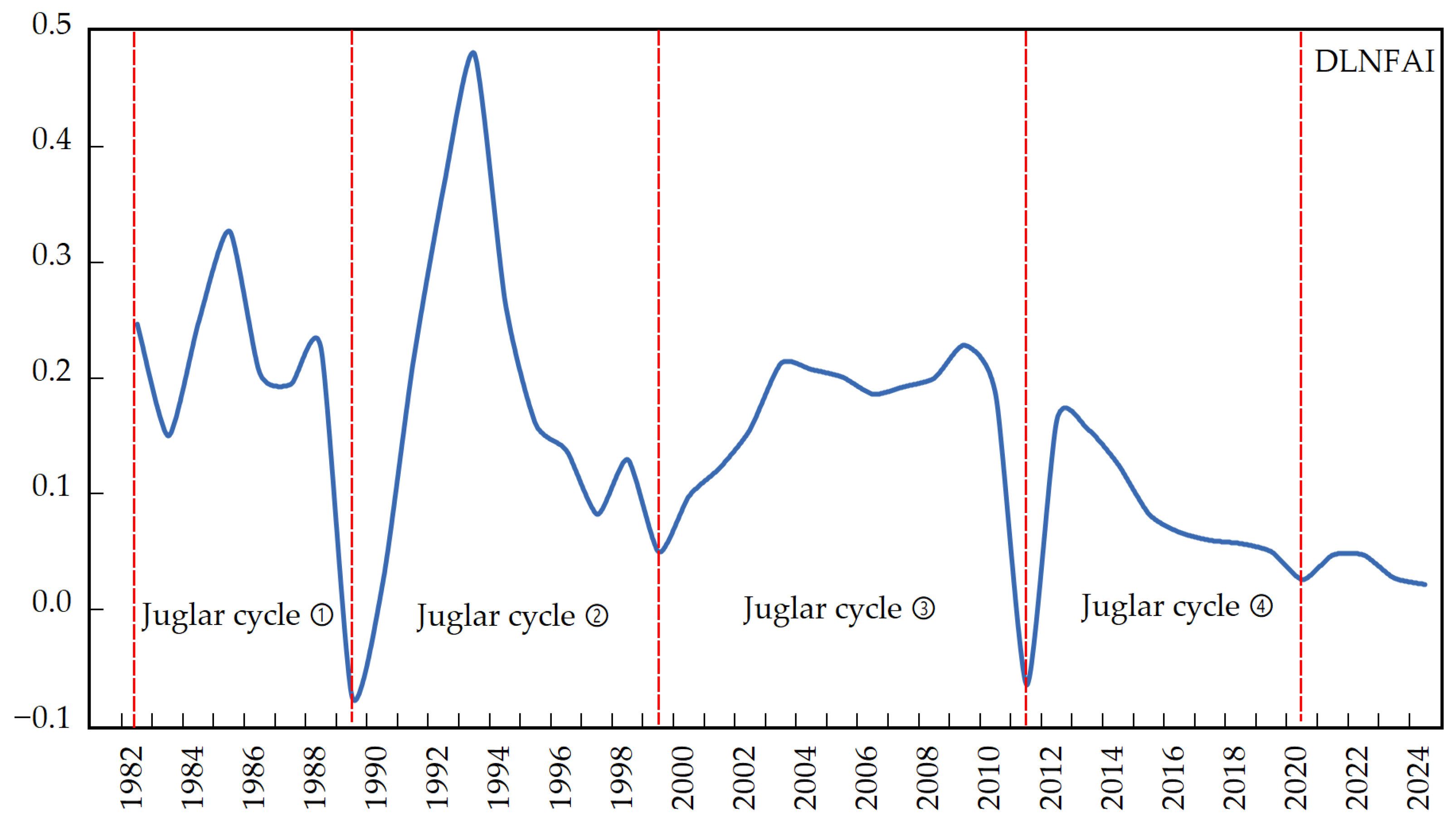 Fixed Asset Investment (FAI): To examine the investment-driven Juglar cycle, real FAI is employed. The nominal FAI series is deflated using the fixed asset investment price index to eliminate the influence of price changes. The Juglar cycle is fundamentally characterized by cyclical fluctuations in FAI. Real FAI, being the most extensive statistic of capital formation in China, directly captures investment activities in equipment, plant construction, and infrastructure. Its inherent volatility reflects the cyclical patterns of equipment replacement, industrial upgrading, and capacity expansion, thus providing a crucial macro-level perspective on China’s investment cycle.