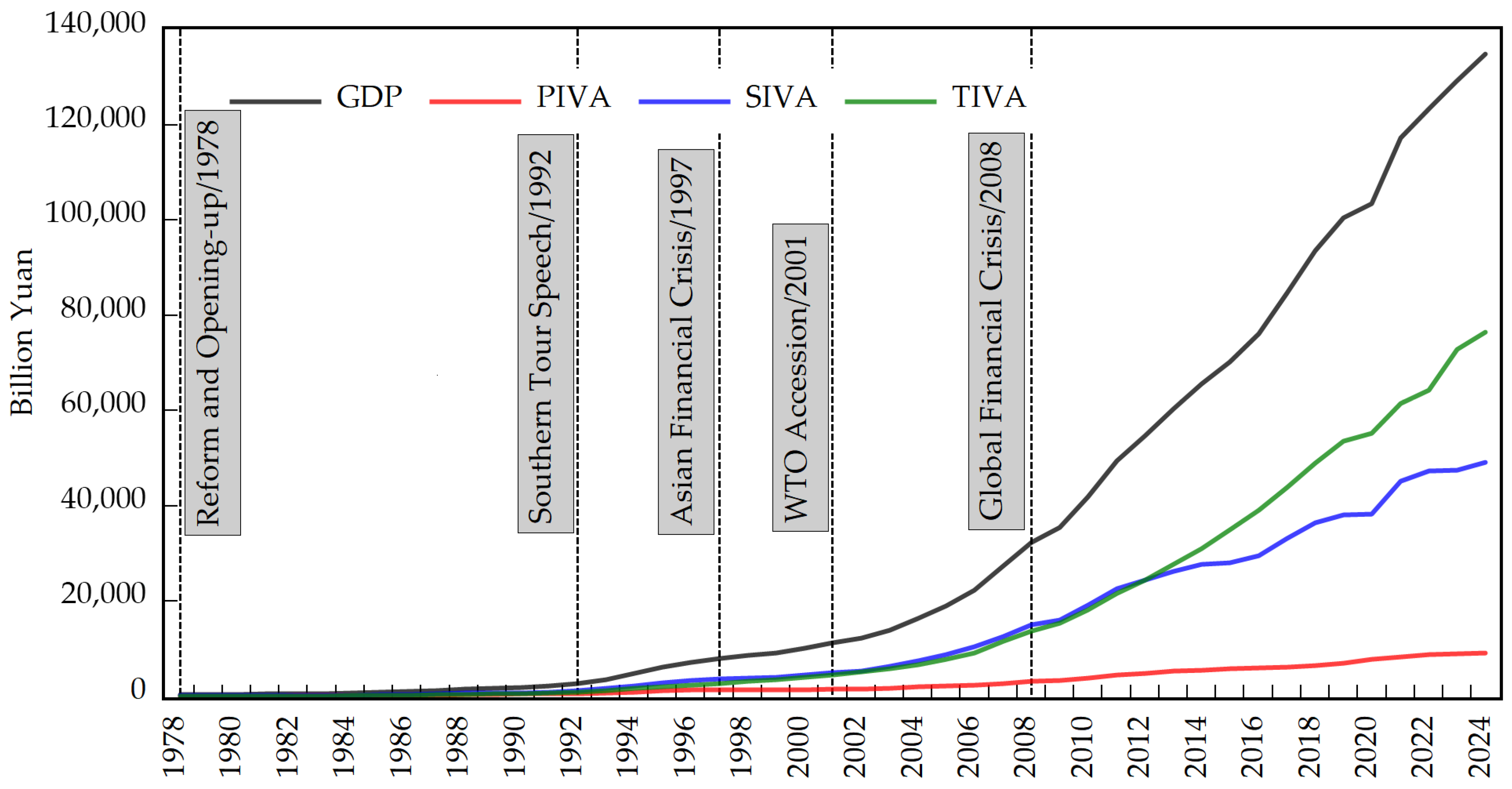 Since the reform and opening-up policy began in 1978, China’s economy has embarked on a high-speed development track, with GDP and the added value of the primary, secondary, and tertiary industries continuously increasing. The industrial structure has undergone deep adjustments and optimizations, leading to significant changes in the proportion of added value of the three industries to GDP. The proportion of the primary industry has been steadily declining; in 1978, it accounted for 27.69% of GDP, dropping to 14.68% by 2000. In the 21st century, this ratio continued to decline, reaching just 6.78% by the end of 2024. This trend reflects the gradual reduction in agriculture’s share in the national economy due to technological advances and industrialization progress. Despite this, agricultural modernization accelerated through measures like technological empowerment and large-scale operations, which led to continuous improvements in production efficiency and quality. The secondary industry displayed phase-specific fluctuations from 1978 to 2006; the proportion of added value of the secondary industry in GDP showed an upward trend, peaking at 47.56% in 2006. The subsequent decline was largely driven by strategic national policies, specifically the Supply-Side Structural Reforms and stringent environmental protection laws enacted after 2015. These policies deliberately phased out excess capacity in heavy industries (e.g., steel, coal) and reoriented investment towards advanced manufacturing and services, accelerating the sector’s relative contraction.