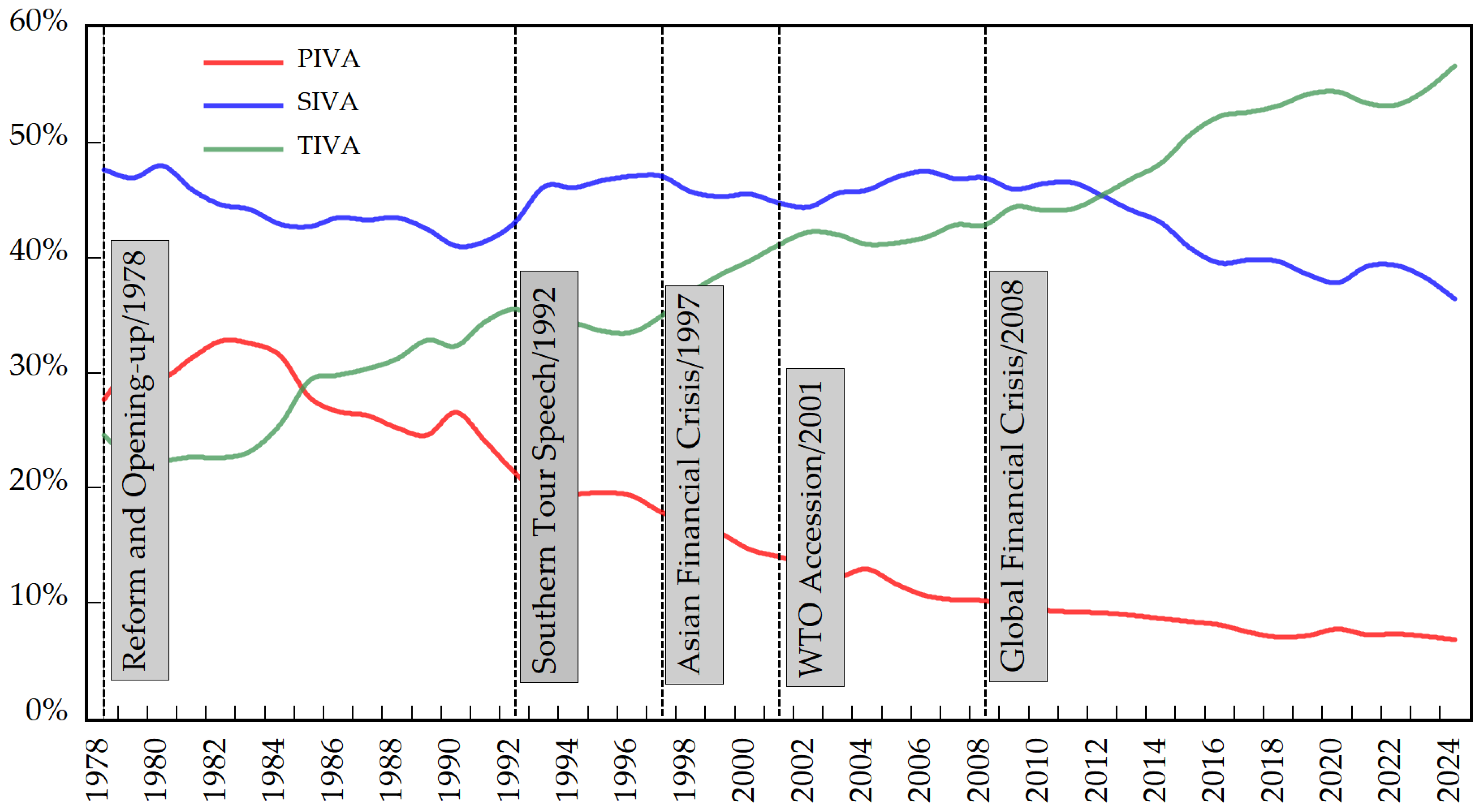 Figure 6, these structural shifts are closely linked to key historical policy milestones. The accelerated decline of the primary sector and the rapid expansion of the secondary industry after 2001, for instance, can be largely attributed to China’s accession to the WTO, which more deeply integrated the nation into global supply chains. Similarly, the stimulus measures implemented after the 2008 Global Financial Crisis temporarily boosted secondary-industry investment. The more recent decline in the secondary sector’s proportion and the simultaneous rise of the tertiary sector, evident from around 2010 onward, are consistent with strategic policy shifts towards environmental protection and a rebalancing of the economy toward consumption and services.