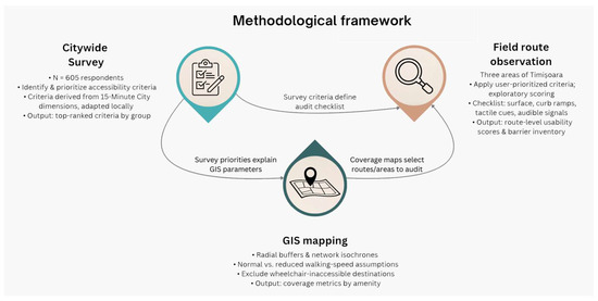 The workflow can be reproduced in other cities using commonly available GIS and survey tools, with minor local calibration: (I) compile points of interest for everyday services from open sources or municipal registries; (II) compute coverage via distance buffers and/or network-based isochrones using a walking profile; (III) apply an accessibility filter (e.g., Wheelmap/OSM flags or targeted audits); (IV) elicit user-prioritized criteria through a short citywide survey (or reuse existing datasets); (V) run targeted route audits against the top-ranked criteria for three user groups (non-disabled residents, mobility impairments, visual impairments). Parameters such as service taxonomy, assumed walking speeds and signage/tactile standards should be locally tuned, while the structure of the overall sequence of steps remains identical.