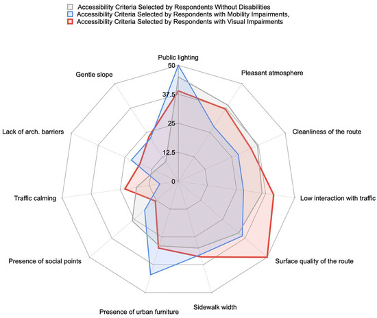 Comparative Accessibility Criteria by User Groups with impairments (red-visual, n = 44 or/and blue-mobility, n = 36, and without impairments, n = 528, grey-overall average values across all respondents, show for reference), source: author representation, results from a conducted survey [31], source: authors’ analysis of data survey (n = 605).
